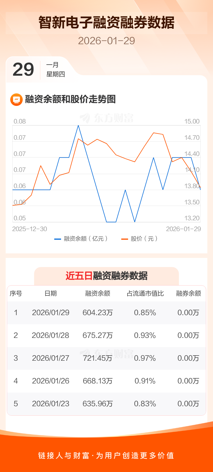 交易所最新数据显示,智新电子于2026年1月29日获融资买入56.55万元,融资偿还127.59万元,当日融资净偿还71.04万元。目前,该股融资余额604.23万,占流通市值比例为0.85%。