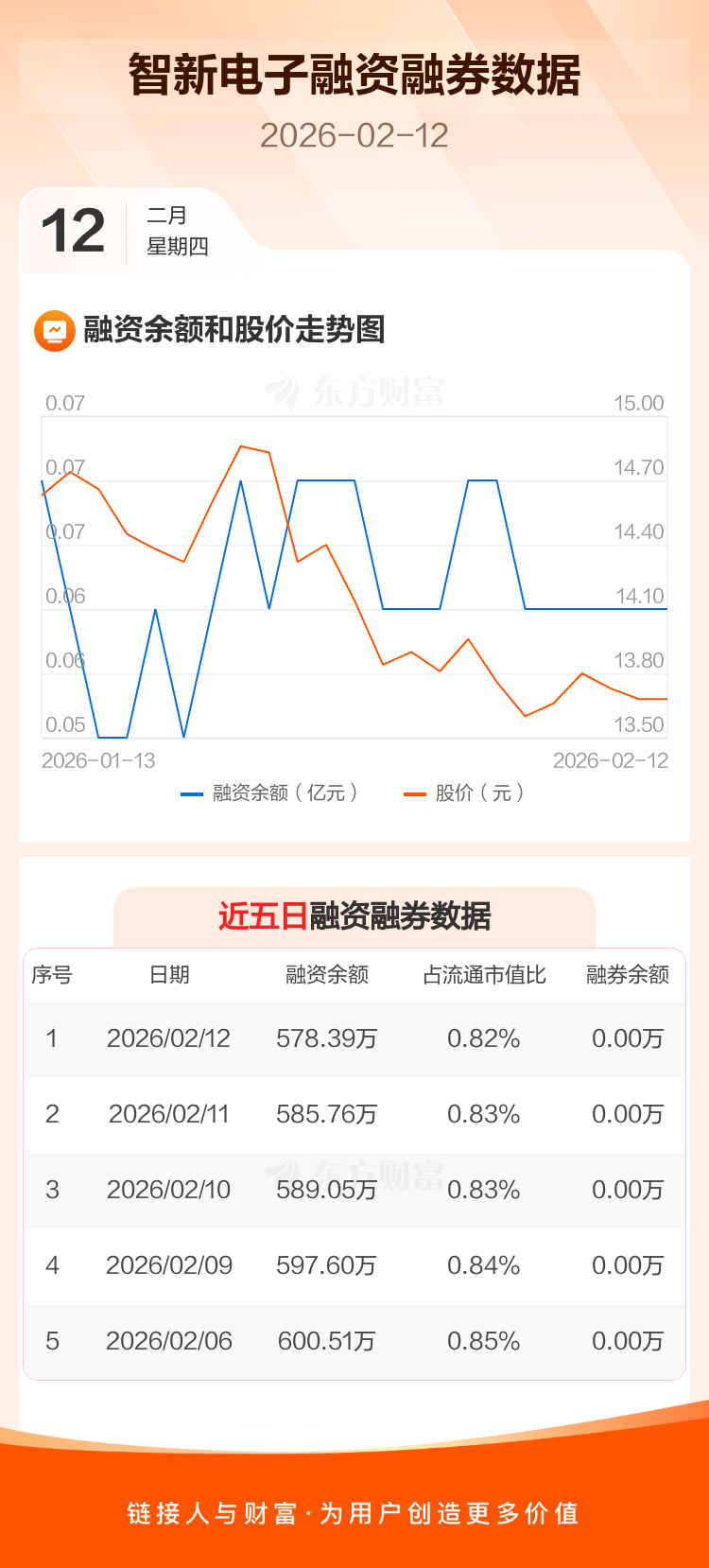 交易所最新数据显示,智新电子于2026年2月12日获融资买入98.45万元,融资偿还105.83万元,当日融资净偿还7.37万元。目前,该股融资余额578.39万,占流通市值比例为0.82%。