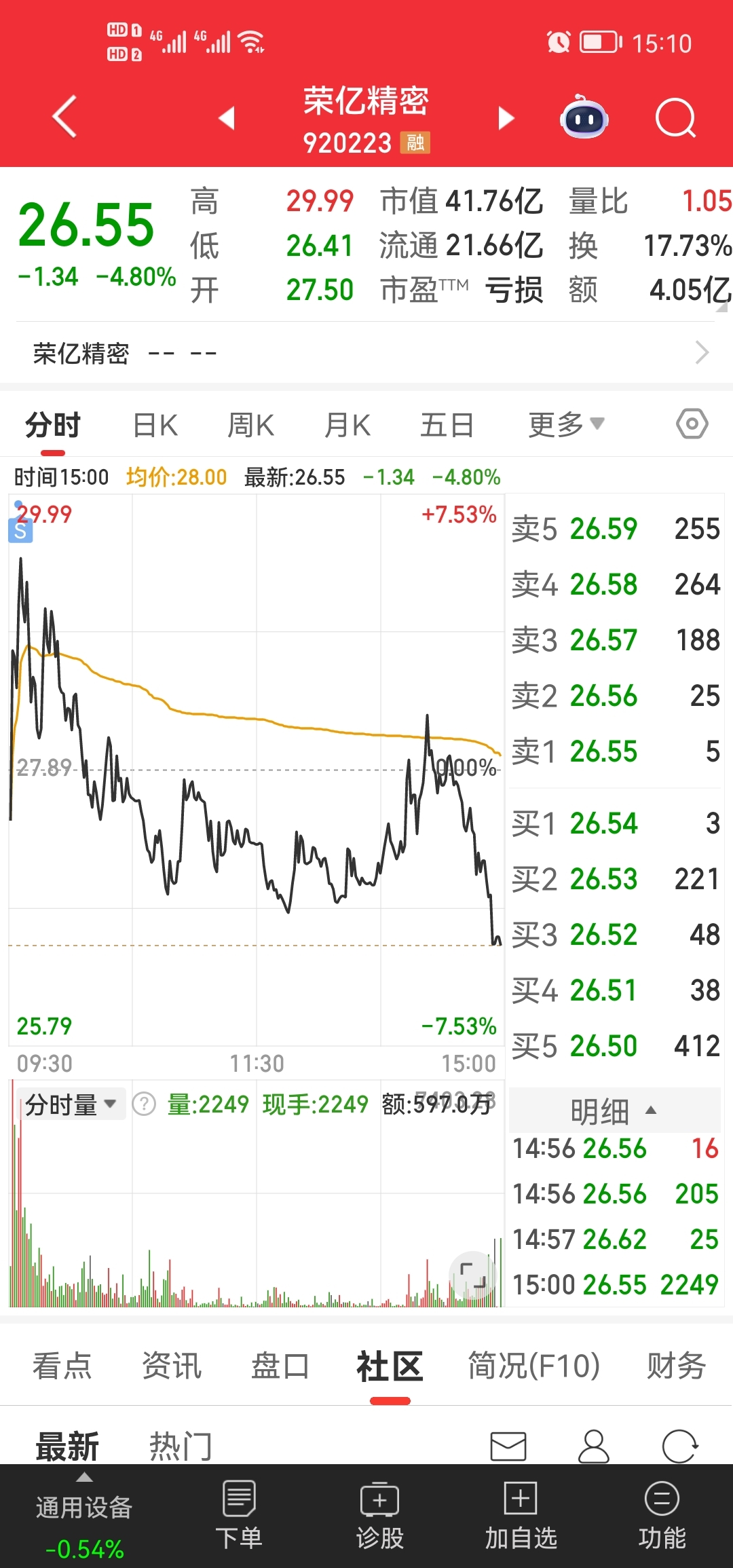 $荣亿精密(SZ920223)$ 还好还好感谢主力