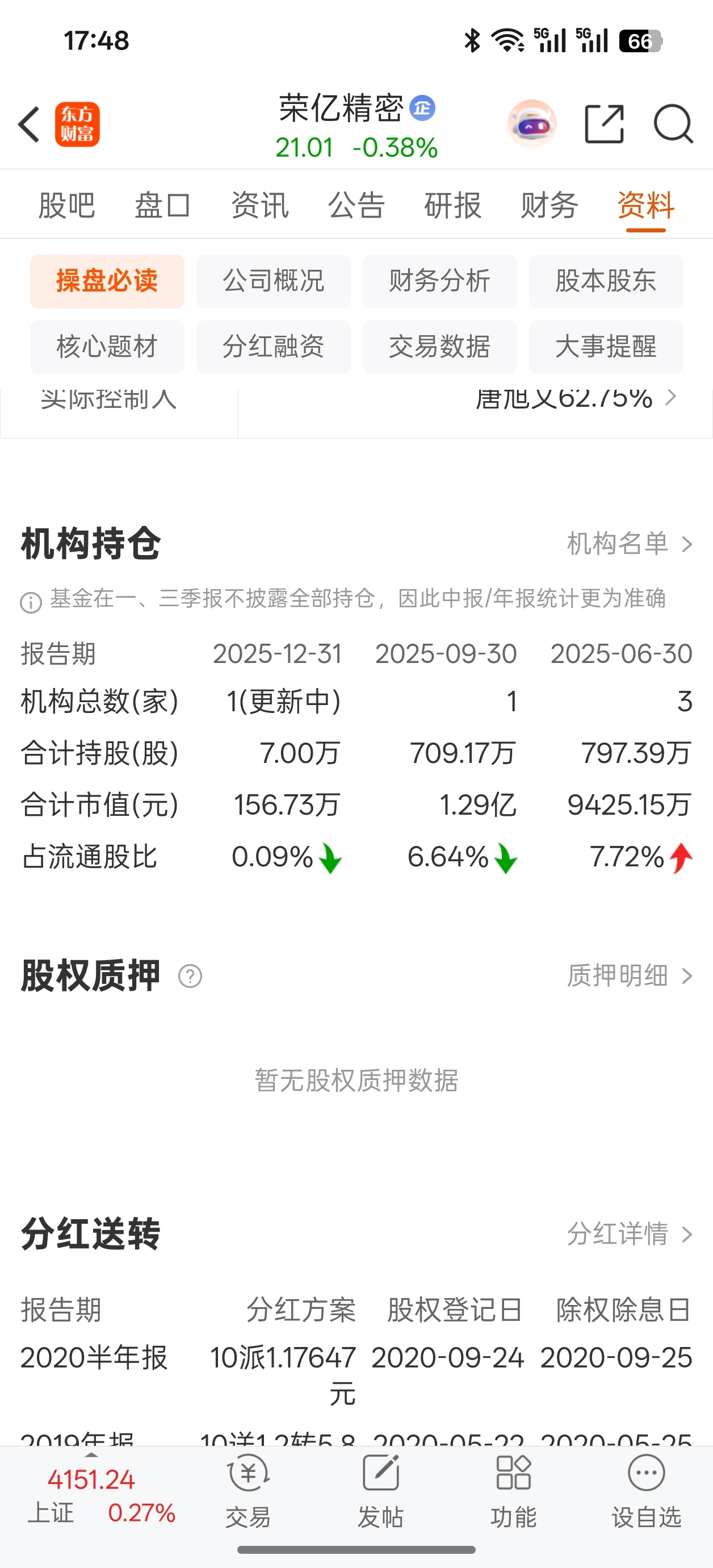 $荣亿精密(SZ920223)$ 看看这个就明白为什么这段时间一直跌了,就剩下一个机构持股,而且从700多万股,减仓剩下7万股!