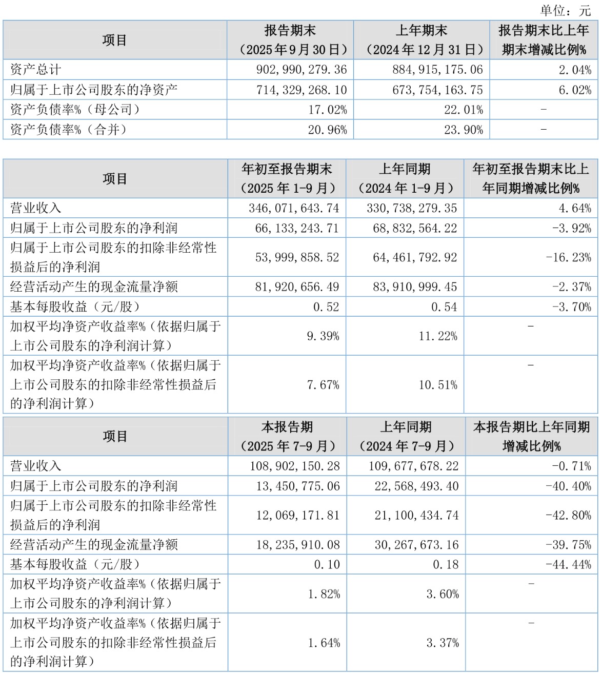 中证智能财讯利通科技(920225)10月27日披露2025年第三季度报告。前三季度公司实现营业总收入3.46亿元,同比增长4.64%;归母净利润6613.32万元,同比下降3.92%;扣非净利润5399.99万元,同比下降16.23%;经营活动产生的现金流量净额为8192.07万元,同比下降2.37%;报告期内,利通科技基本每股收益为0.52元,加权平均净资产收益率为9.39%。