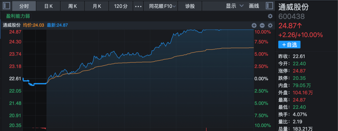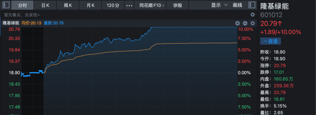 光伏概念午后也大幅走强,光伏设备方向领涨,板块指数飙升8.11%,创近2年新高,成交较昨日增加1倍以上。通威股份、隆基绿能两只千亿市值巨头双双涨停,阳光电源则创历史新高,天合光能、固德威等亦强势涨停或涨超10%。