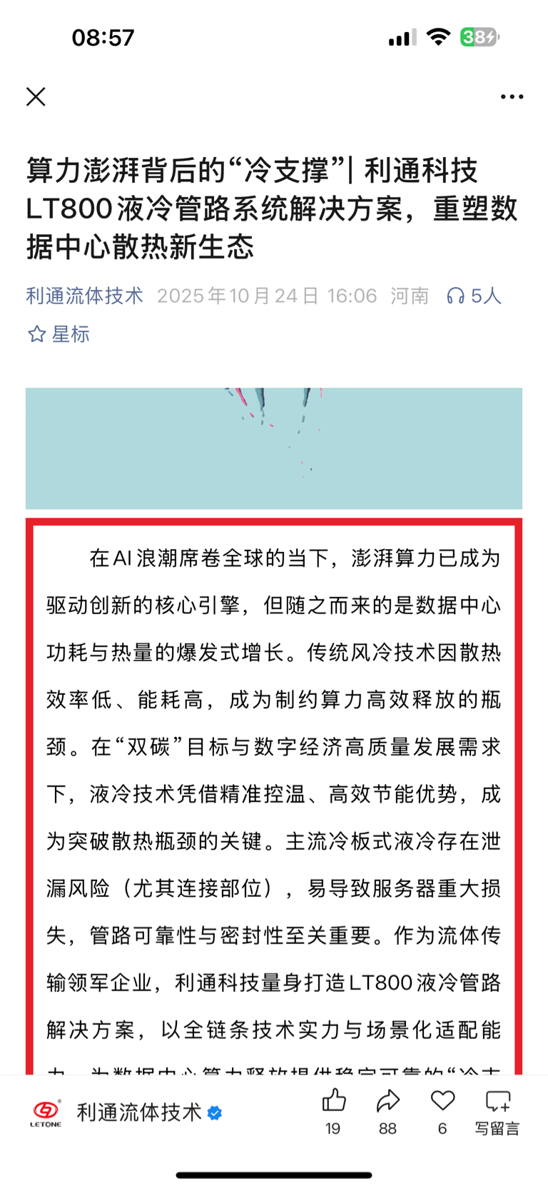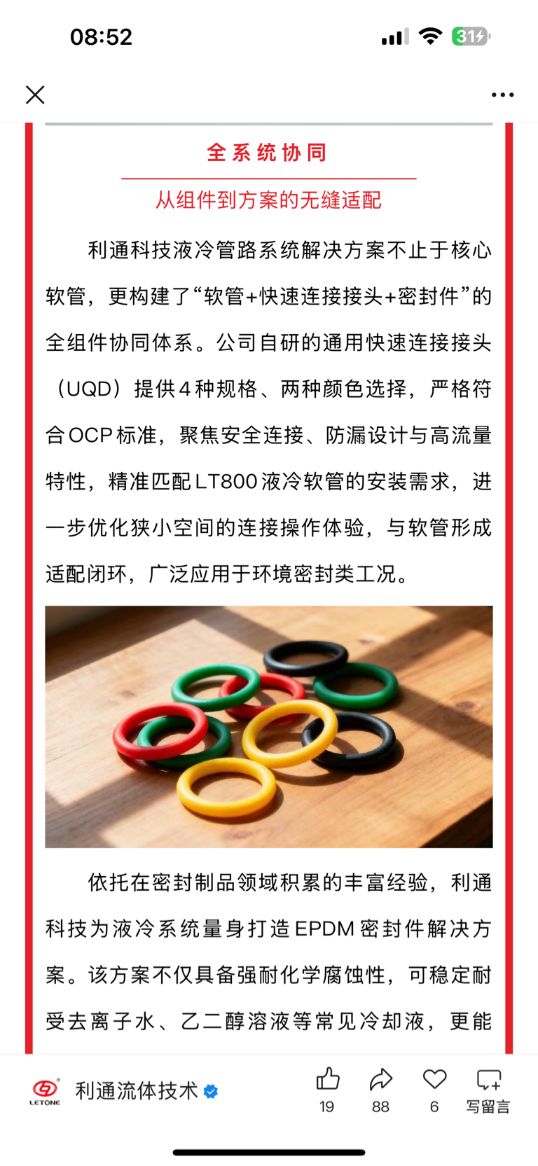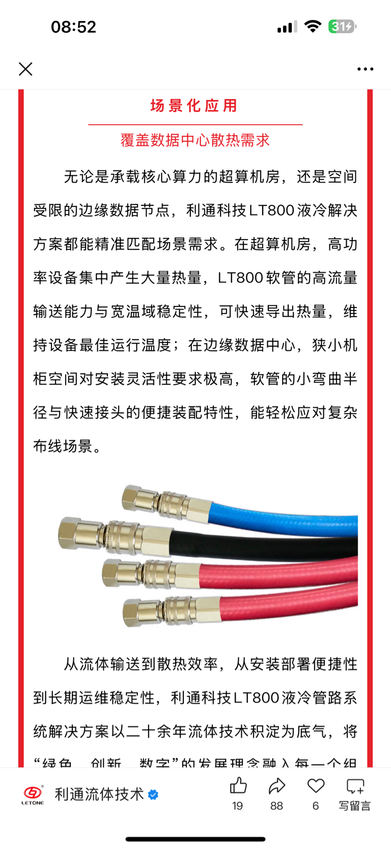 $利通科技(SZ920225)$ 全新液冷LT800管路软管+快速连接接头+密封件都有,杀入全新赛道液冷!今天应该有一个涨停!