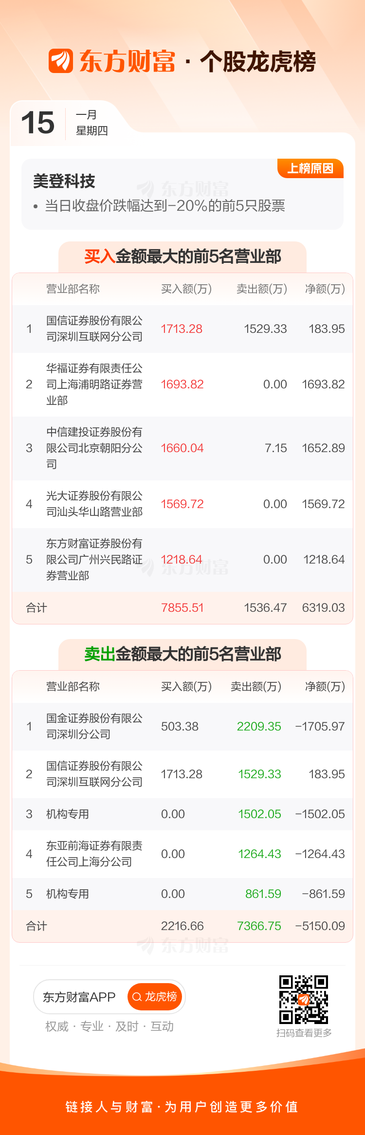 交易所2026年1月15日公布的交易公开信息显示,美登科技因成为当日收盘价跌幅达到-20%的前5只股票上榜。美登科技当日收报89元,涨跌幅-23.12%,偏离值-23.12%,换手率29.17%,成交额4.98亿。
