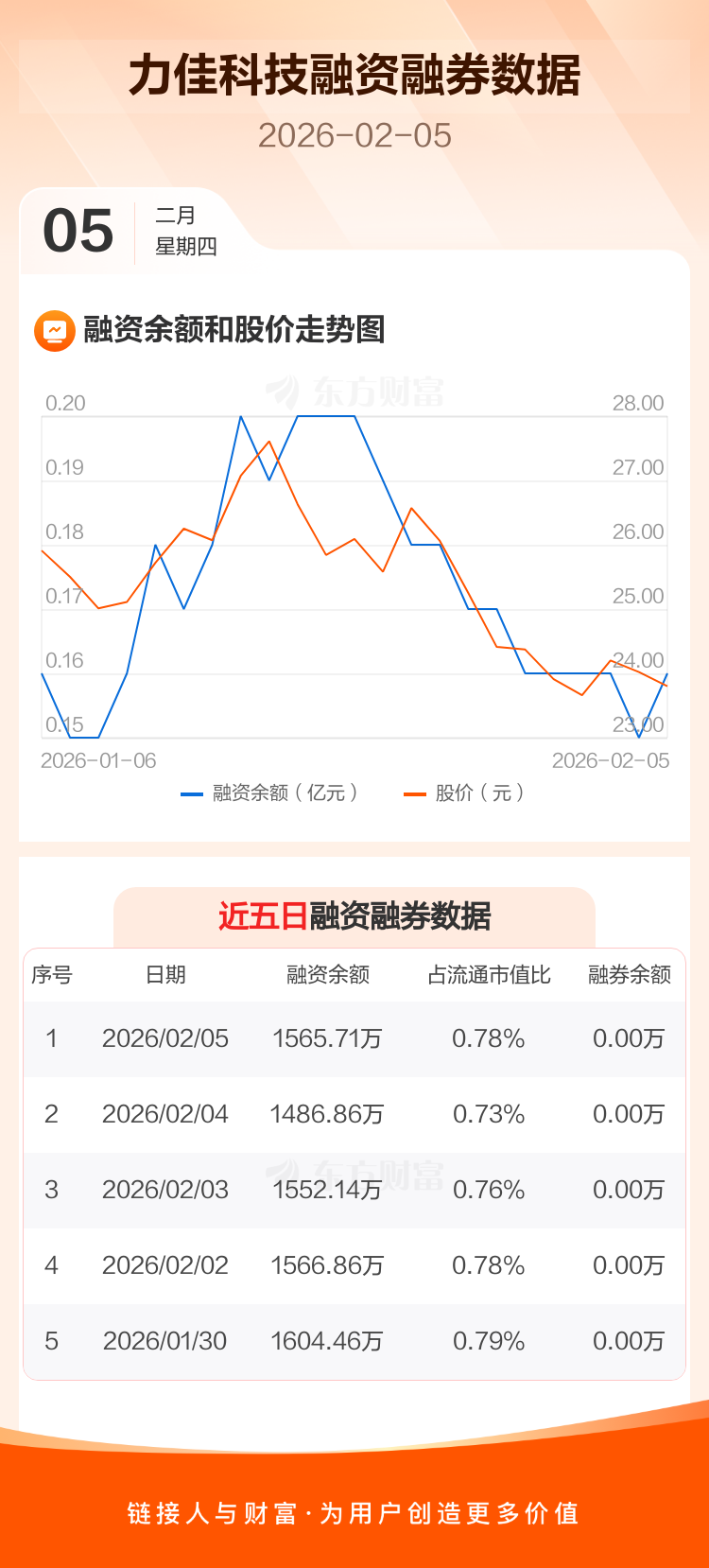 交易所最新数据显示,力佳科技于2026年2月5日获融资买入154.59万元,融资偿还75.75万元,当日融资净买入78.85万元。目前,该股融资余额1565.71万,占流通市值比例为0.78%。