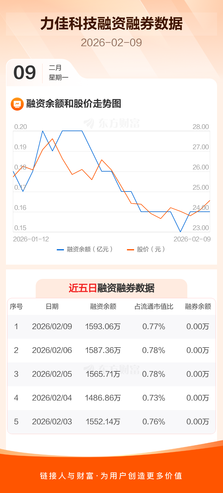 交易所最新数据显示,力佳科技于2026年2月9日获融资买入190.36万元,融资偿还184.66万元,当日融资净买入5.7万元。目前,该股融资余额1593.06万,占流通市值比例为0.77%。