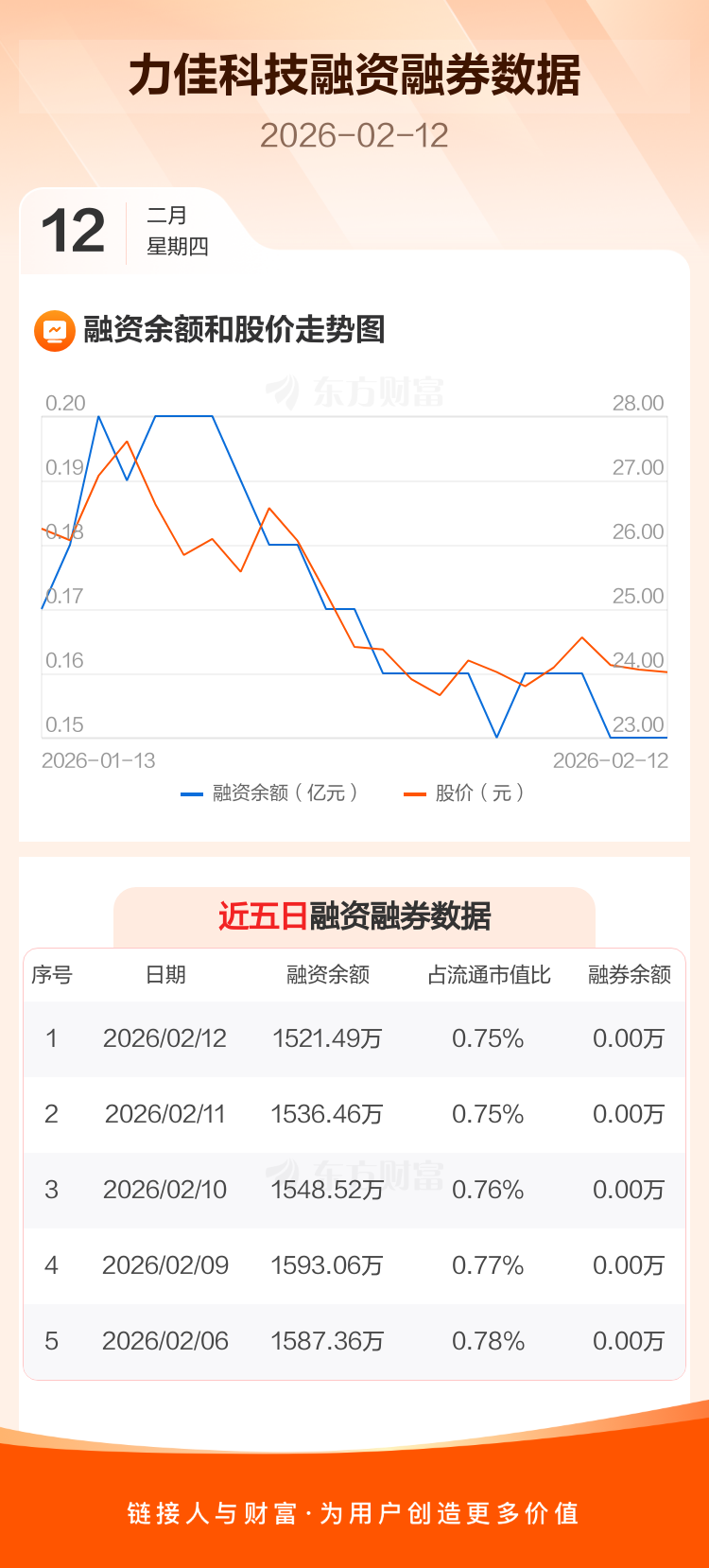 交易所最新数据显示,力佳科技于2026年2月12日获融资买入128.01万元,融资偿还142.99万元,当日融资净偿还14.97万元。目前,该股融资余额1521.49万,占流通市值比例为0.75%。