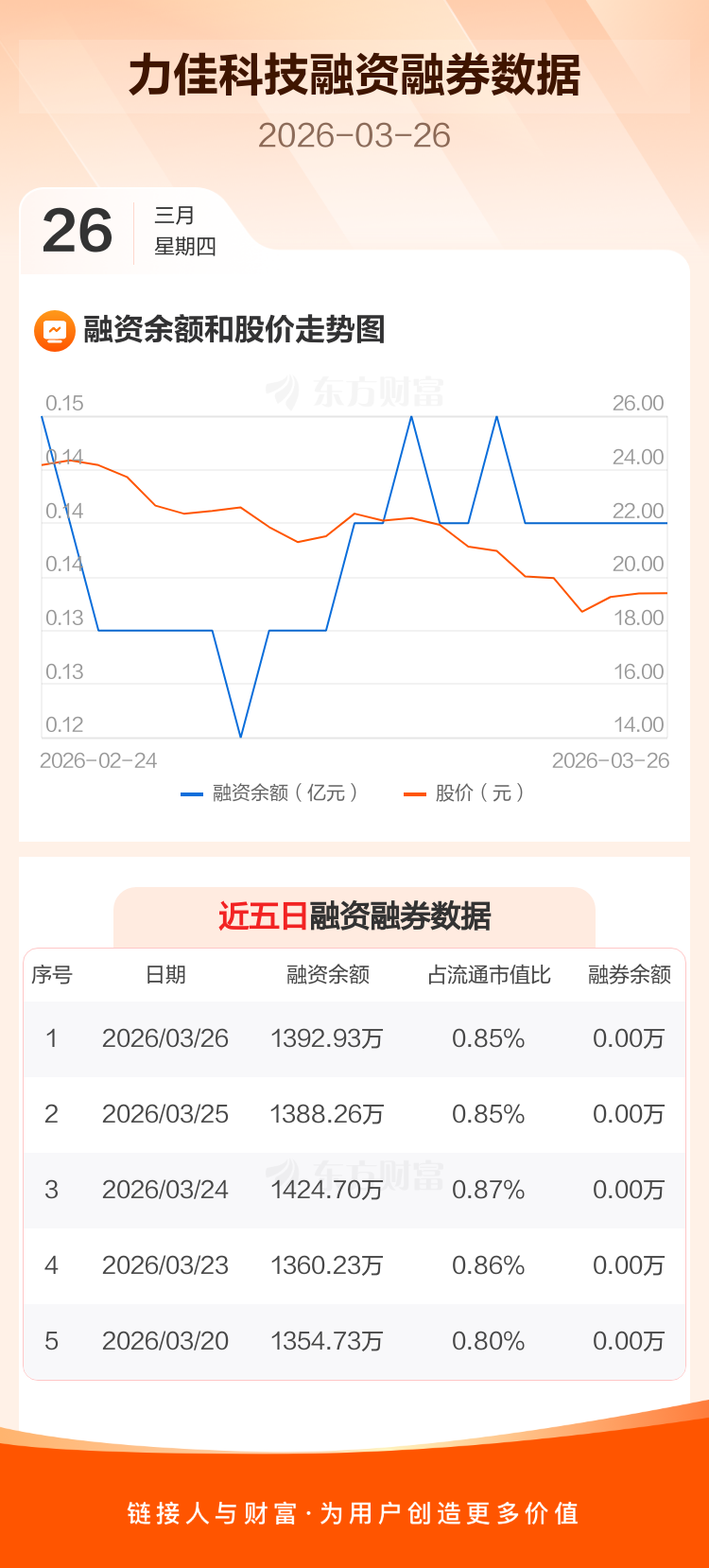 交易所最新数据显示,力佳科技于2026年3月26日获融资买入84.37万元,融资偿还79.69万元,当日融资净买入4.68万元。目前,该股融资余额1392.93万,占流通市值比例为0.85%。