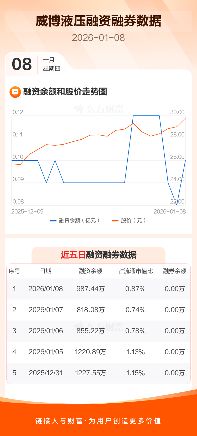 交易所最新数据显示,威博液压于2026年1月8日获融资买入236.99万元,融资偿还67.62万元,当日融资净买入169.36万元。目前,该股融资余额987.44万,占流通市值比例为0.87%。