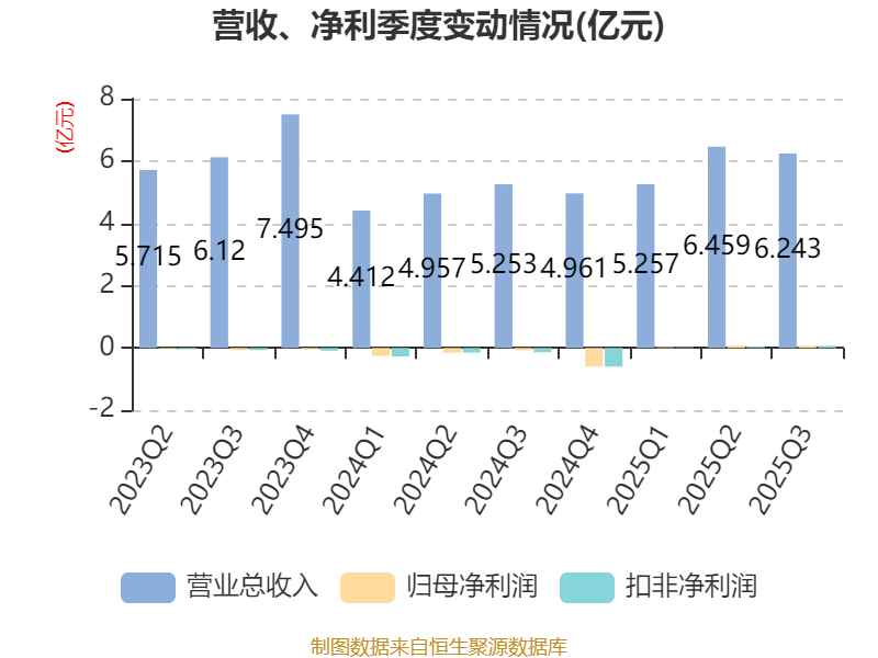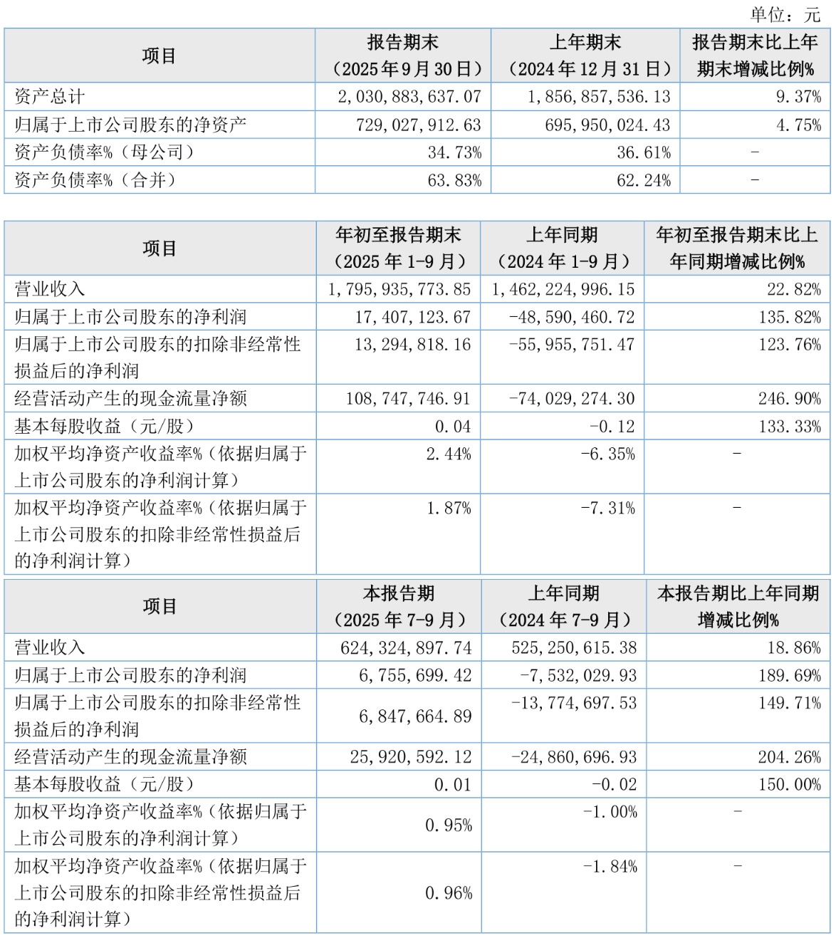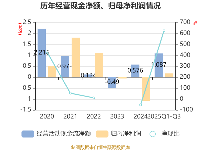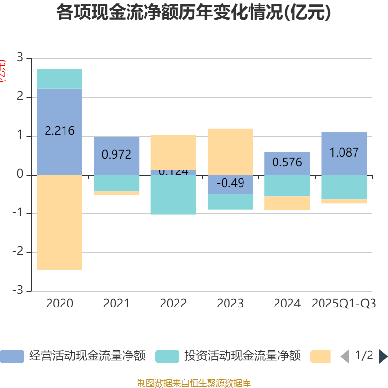 2025年前三季度,公司经营活动现金流净额为1.09亿元,同比增加1.83亿元;筹资活动现金流净额-1005.7万元,同比减少8676.19万元;投资活动现金流净额-6409.7万元,上年同期为-3848.24万元。