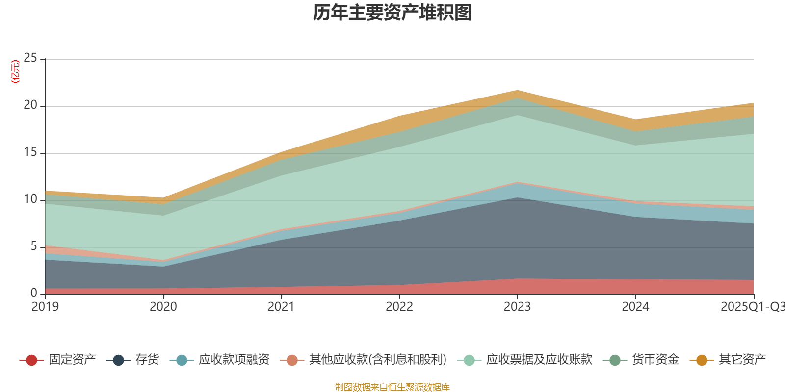 资产重大变化方面,截至2025年三季度末,公司存货较上年末减少9.61%,占公司总资产比重下降6.19个百分点;应收票据及应收账款较上年末增加29.96%,占公司总资产比重上升6个百分点;货币资金较上年末增加23.71%,占公司总资产比重上升1.06个百分点;固定资产较上年末减少3.64%,占公司总资产比重下降1.01个百分点。
