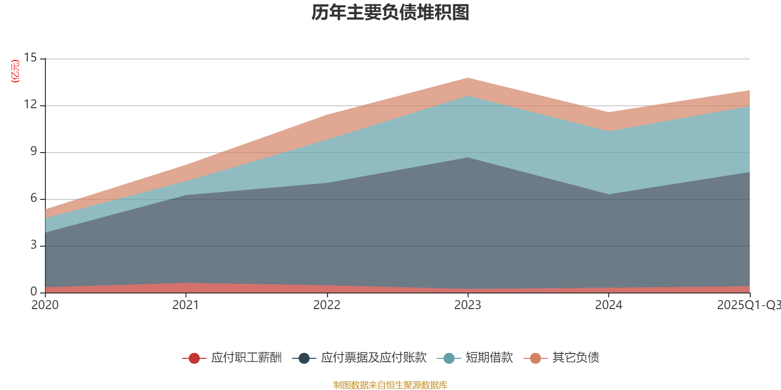 负债重大变化方面,截至2025年三季度末,公司应付票据及应付账款较上年末增加22.15%,占公司总资产比重上升3.77个百分点;短期借款较上年末增加4.53%,占公司总资产比重下降0.96个百分点;一年内到期的非流动负债较上年末减少30.91%,占公司总资产比重下降0.56个百分点;其他应付款(含利息和股利)较上年末减少35.44%,占公司总资产比重下降0.34个百分点。