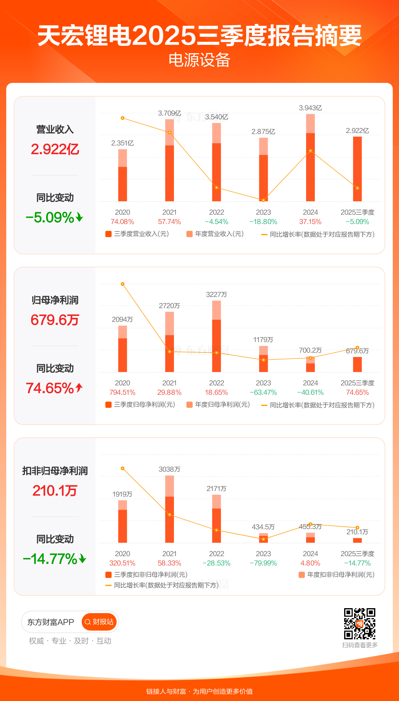 天宏锂电10月28日发布2025年三季报显示,公司前三季实现营业收入2.92亿元,同比下滑5.09%;归母净利润679.65万元,同比增长74.65%;扣非归母净利润210.11万元,同比下滑14.77%。