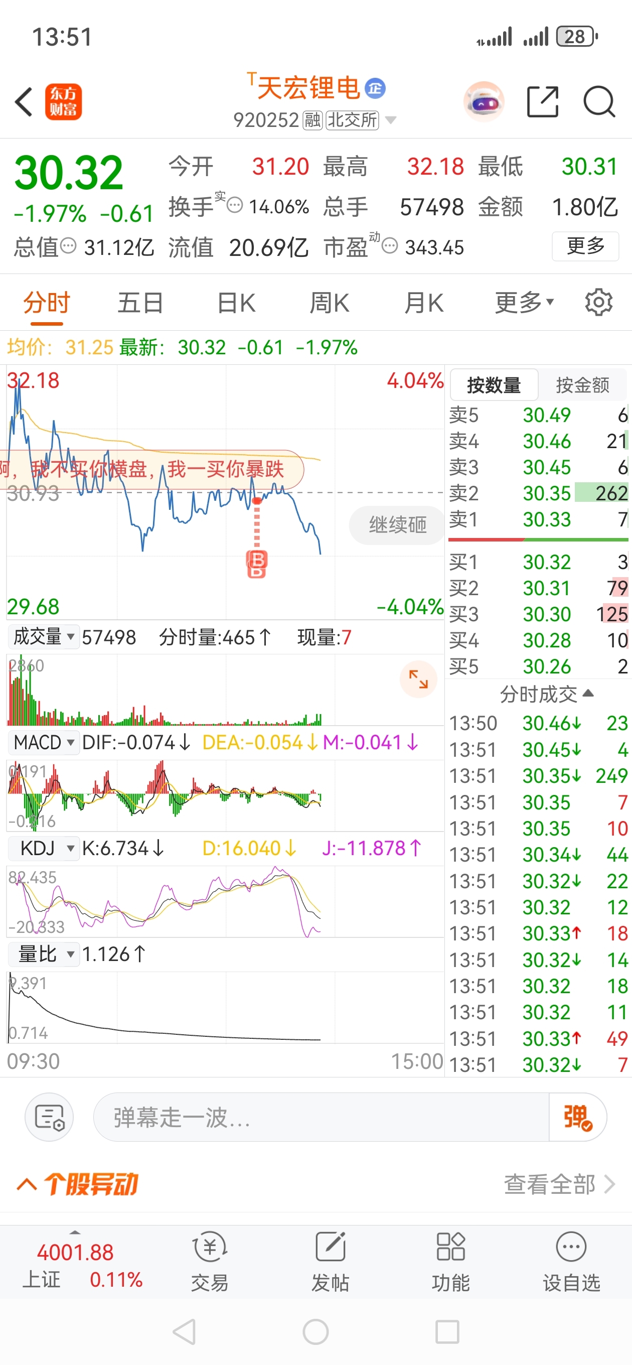 $天宏锂电(SZ920252)$ 这票现在这么垃圾了吗?板块高潮你暴跌?我不买它就横盘,我一买就开始暴跌?