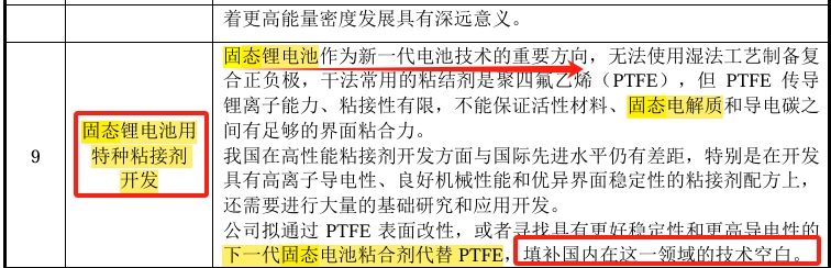 固态电池特种材料填补国内空白,固态锂电池用特种粘接剂开发,公司拟通过PTFE表面改性,或者寻找具有更好稳定性和更高导电性的一代固态电池粘合剂代替PTFE,填补国内在这一领域的技术空白。(下图)