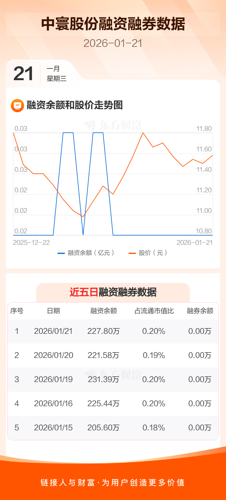 交易所最新数据显示,中寰股份于2026年1月21日获融资买入7.49万元,融资偿还1.27万元,当日融资净买入6.22万元。目前,该股融资余额227.80万,占流通市值比例为0.20%。