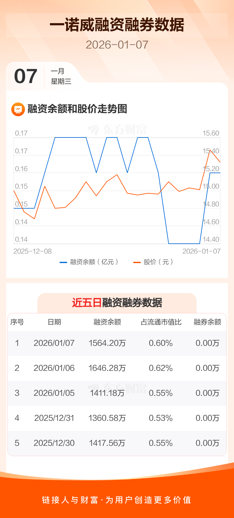 交易所最新数据显示,一诺威于2026年1月7日获融资买入208.03万元,融资偿还290.10万元,当日融资净偿还82.07万元。目前,该股融资余额1564.21万,占流通市值比例为0.60%。