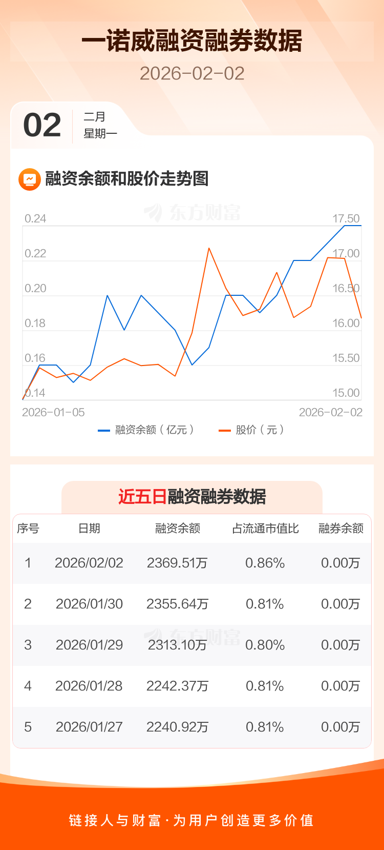 交易所最新数据显示,一诺威于2026年2月2日获融资买入295.53万元,融资偿还281.67万元,当日融资净买入13.87万元。目前,该股融资余额2369.51万,占流通市值比例为0.86%。