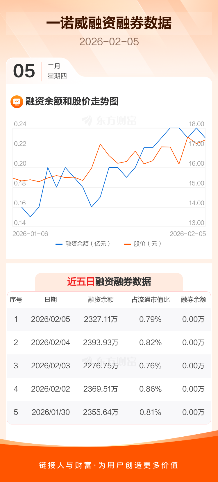 交易所最新数据显示,一诺威于2026年2月5日获融资买入288.40万元,融资偿还355.22万元,当日融资净偿还66.82万元。目前,该股融资余额2327.11万,占流通市值比例为0.79%。