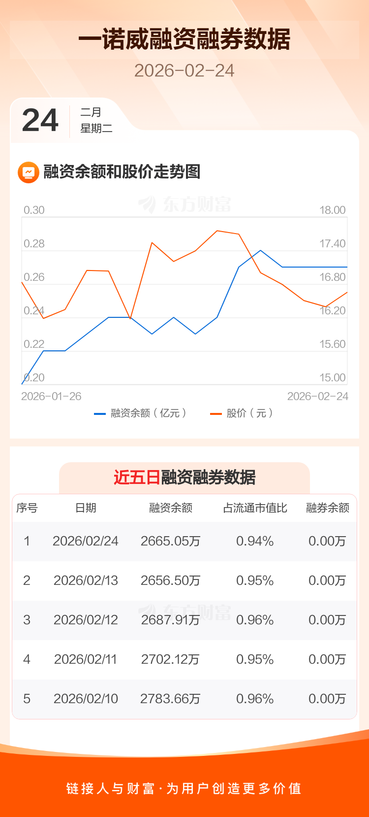 交易所最新数据显示,一诺威于2026年2月24日获融资买入131.28万元,融资偿还122.73万元,当日融资净买入8.55万元。目前,该股融资余额2665.05万,占流通市值比例为0.94%。