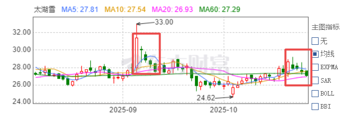 这股9月4日上涨幅到33元后就直接4根阴线连跌四天,10月29日冲倒28.9元后