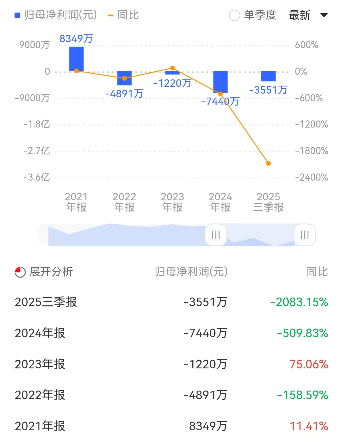 2025年前三季度,公司实现营业总收入3.04亿元,同比下降27.64%;归属于上市公司股东的净利润为-3551万元,同比暴降2083.15%。