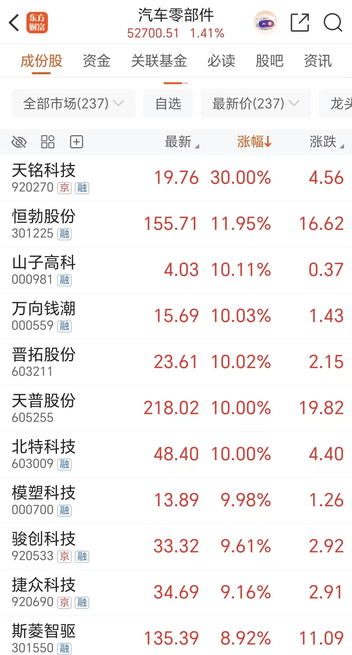 周二(12月30日)受机器人概念爆火带动,汽车零件板块掀起涨停潮,天铭科技30CM涨停,恒勃股份涨近12%,山子高科、万向钱潮、晋拓股份、天普股份、北特科技等多股涨停。
