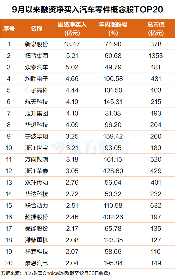 新泉股份排名第一,融资净买入超18亿元;拓普集团排名第二,融资净买入超5亿元。