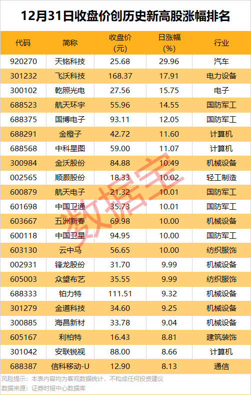 收盘价创历史新高股中,今日股价平均上涨6.51%,涨停的有天铭科技、顺灏股份、航天电子等,涨幅居前的有飞沃科技、乾照光电、航天环宇等。