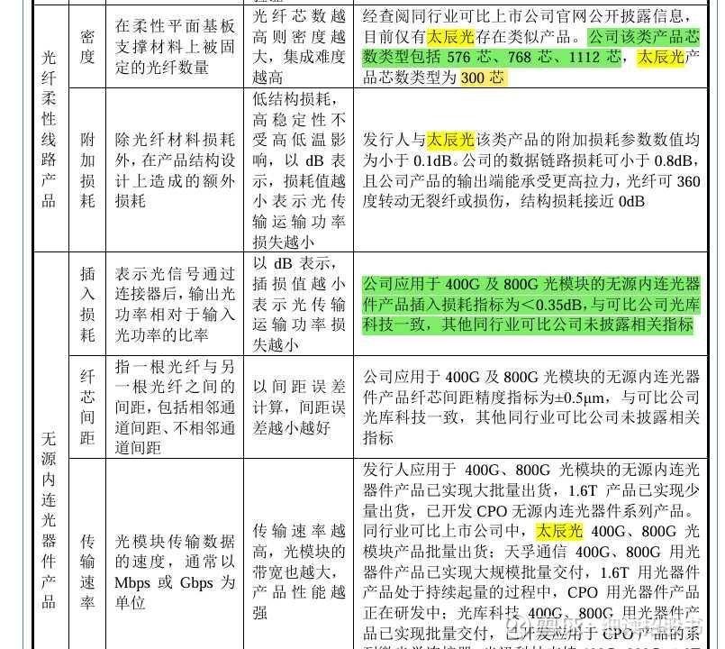 公司超大芯数光纤预端接布线总成产品芯数可达 3456 芯,太辰光384芯;(越多越好)公司光纤连接器产品光线损耗值为 0.12dB,太辰光、光库科技<0.2 至<0.75;(越小越好)公司应用于 400G 及 800G 光模块的无源内连光器件产品插入损耗指标为<0.35dB,与可比公司光库科技一致;公司光纤柔性产品芯数类型包括 576 芯、768 芯、1112 芯,太辰光产品芯数类型为 300 芯;公司应用于 400G及800G光模块的无源内连光器件产品纤芯间距精度指标为+0.5um,与可比公司光库科技一致;