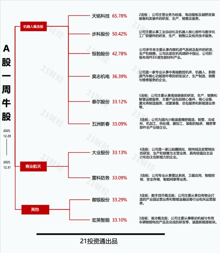 本期牛股榜中,北交所个股天铭科技(920270.BJ)以65.78%的周涨幅夺魁,步科股份(688160.SH)以50.42%的涨幅位居第二,本期牛股榜十只个股本周累计涨幅均超过33%。