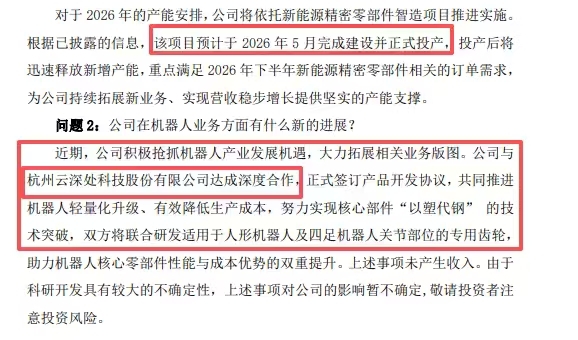 近期调研显示公司与杭州云深处科技股份有限公司达成深度合作,双方将联合研发适用于人形机器人及四足机器人关节部位的专用齿轮。目前市场高标都是人形机器人股,等待风来!$天力复合(SZ920576)$ $捷众科技(SZ920690)$ $惠同新材(SZ920751)$