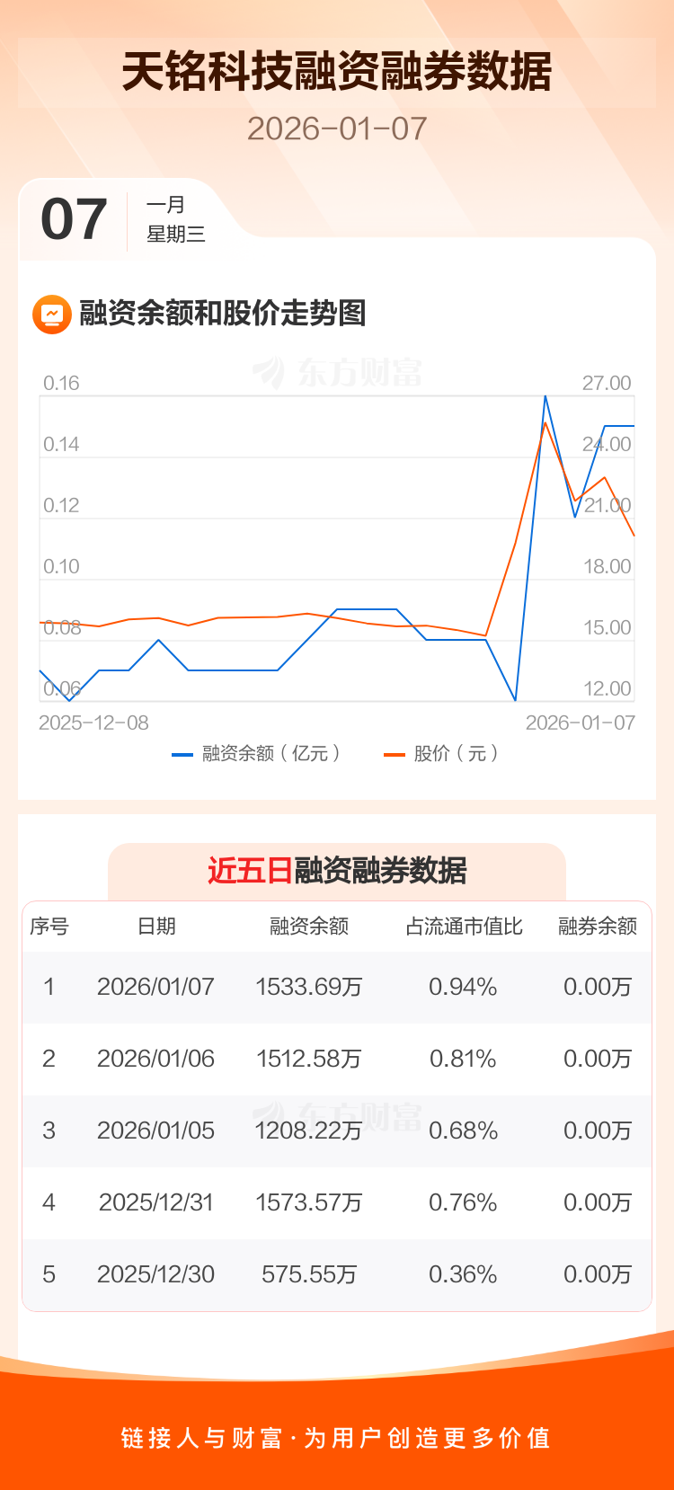 交易所最新数据显示,天铭科技于2026年1月7日获融资买入687.25万元,融资偿还666.14万元,当日融资净买入21.11万元。目前,该股融资余额1533.69万,占流通市值比例为0.94%。