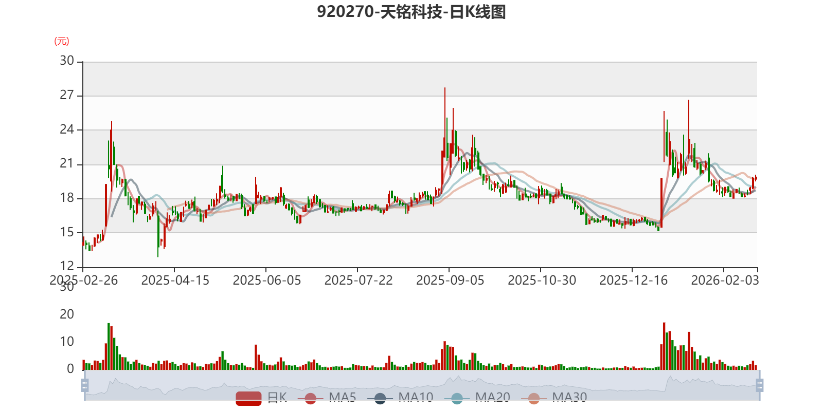 中证智能财讯天铭科技(920270)2月26日晚间披露2025年业绩快报,公司实现营业收入2.13亿元,同比下降15.96%;归母净利润3606.87万元,同比下降42.01%;扣非净利润3310.42万元,同比下降43.78%;基本每股收益0.34元,加权平均净资产收益率为8.65%。以2月26日收盘价计算,天铭科技目前市盈率(TTM)约为57.66倍,市净率(LF)约5.1倍,市销率(TTM)约9倍。