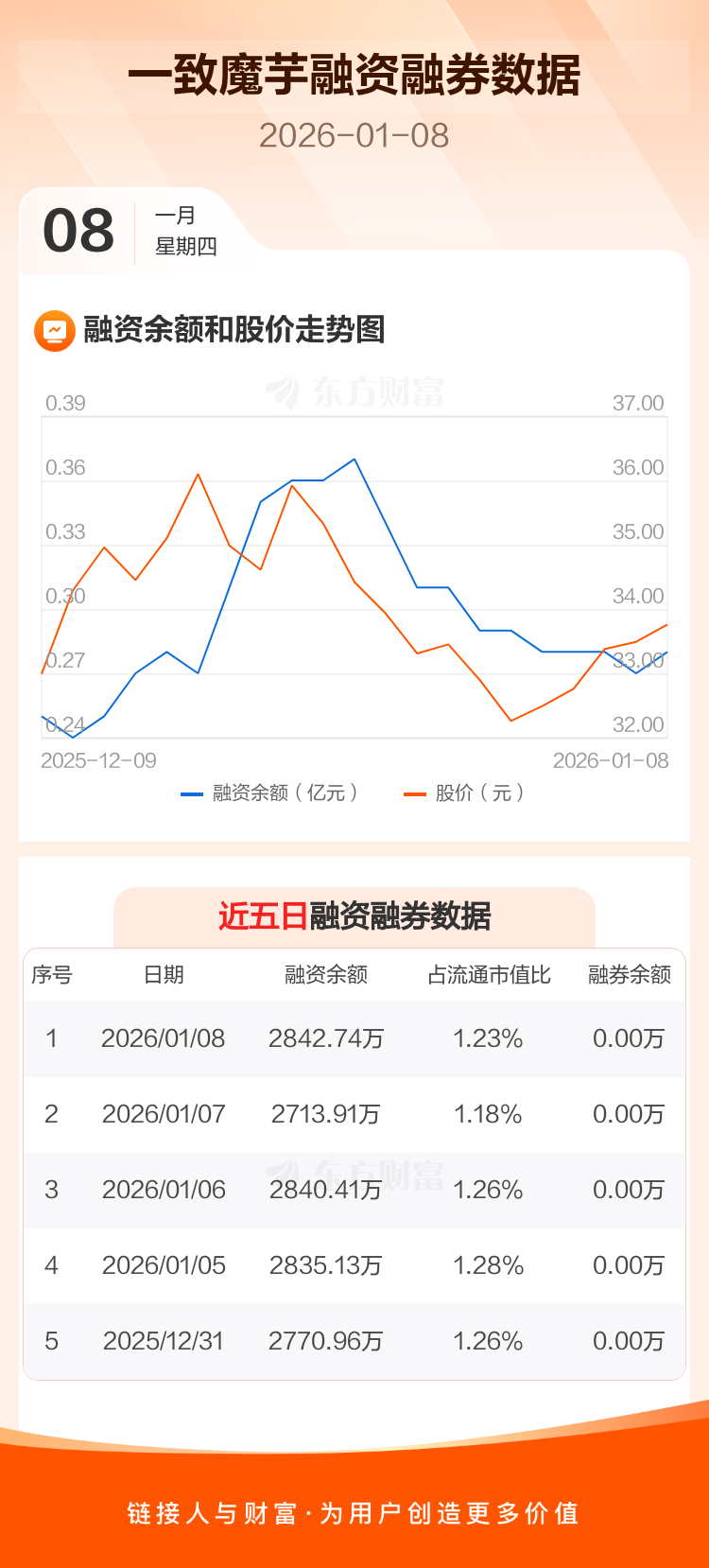 交易所最新数据显示,一致魔芋于2026年1月8日获融资买入458.31万元,融资偿还329.48万元,当日融资净买入128.83万元。目前,该股融资余额2842.74万,占流通市值比例为1.23%。