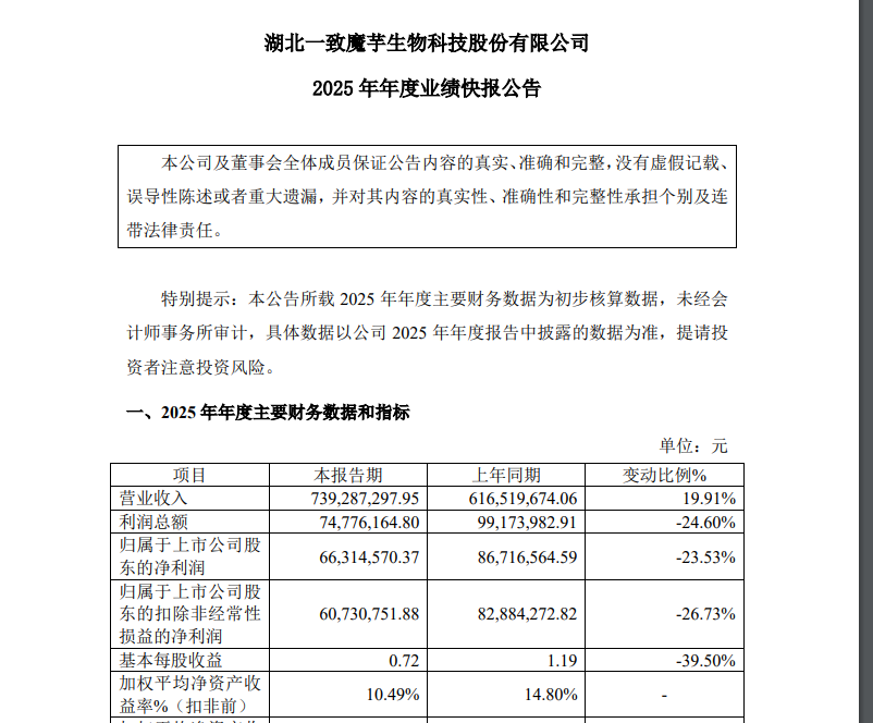 2月26日,一致魔芋(920273)发布公告,2025年年度业绩快报显示,公司实现营业收入7.39亿元,同比增长19.91%。归母净利润为6631万元,同比下降23.53%。