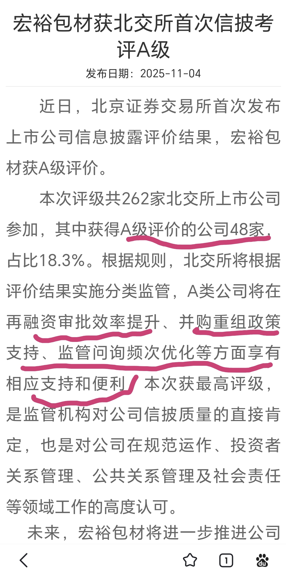 $宏裕包材(SZ920274)$ 宏裕包材获北交所首次信披考评A级