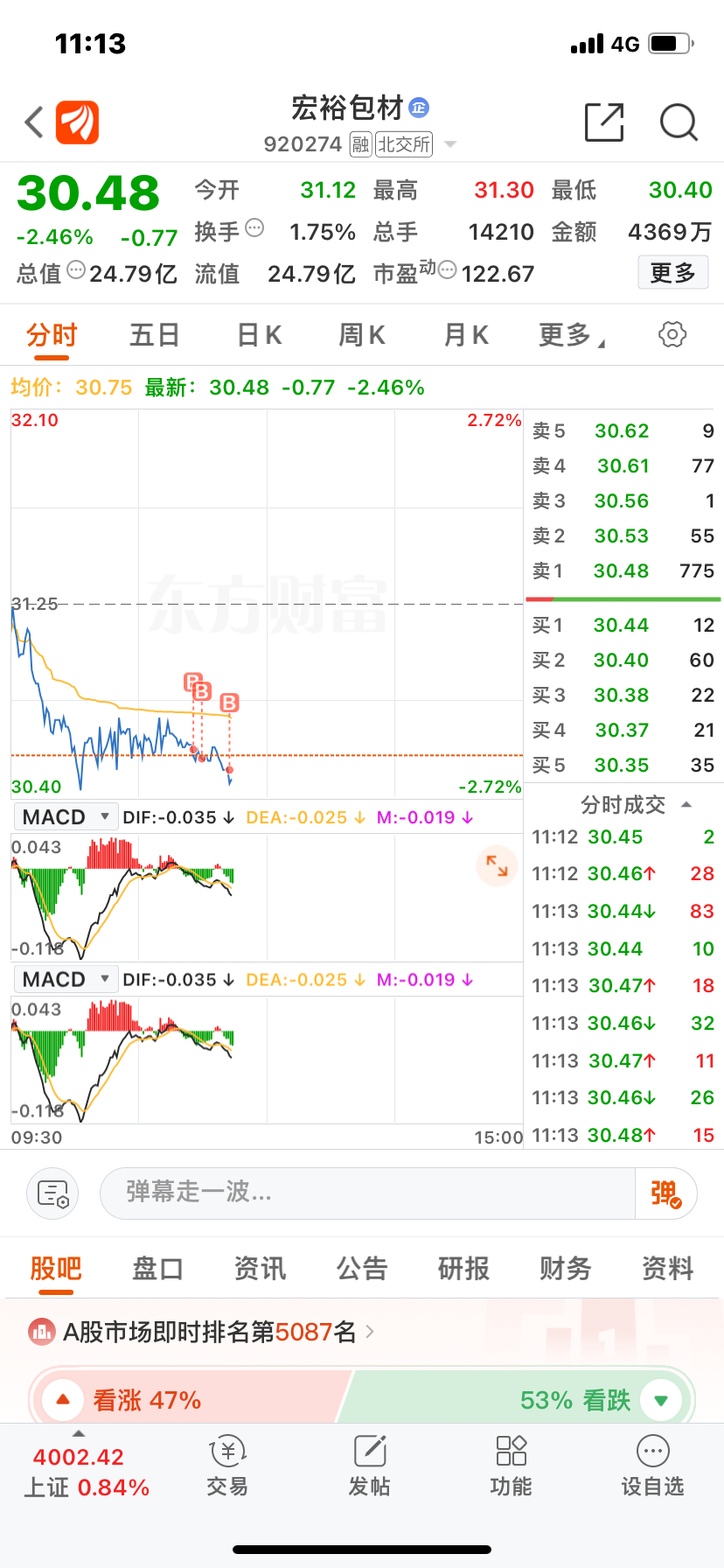 $宏裕包材(SZ920274)$ 上次4000股赚12个点走了,今天入手3000,但愿明天不要7连阴烧头7。主力!是不是呀?