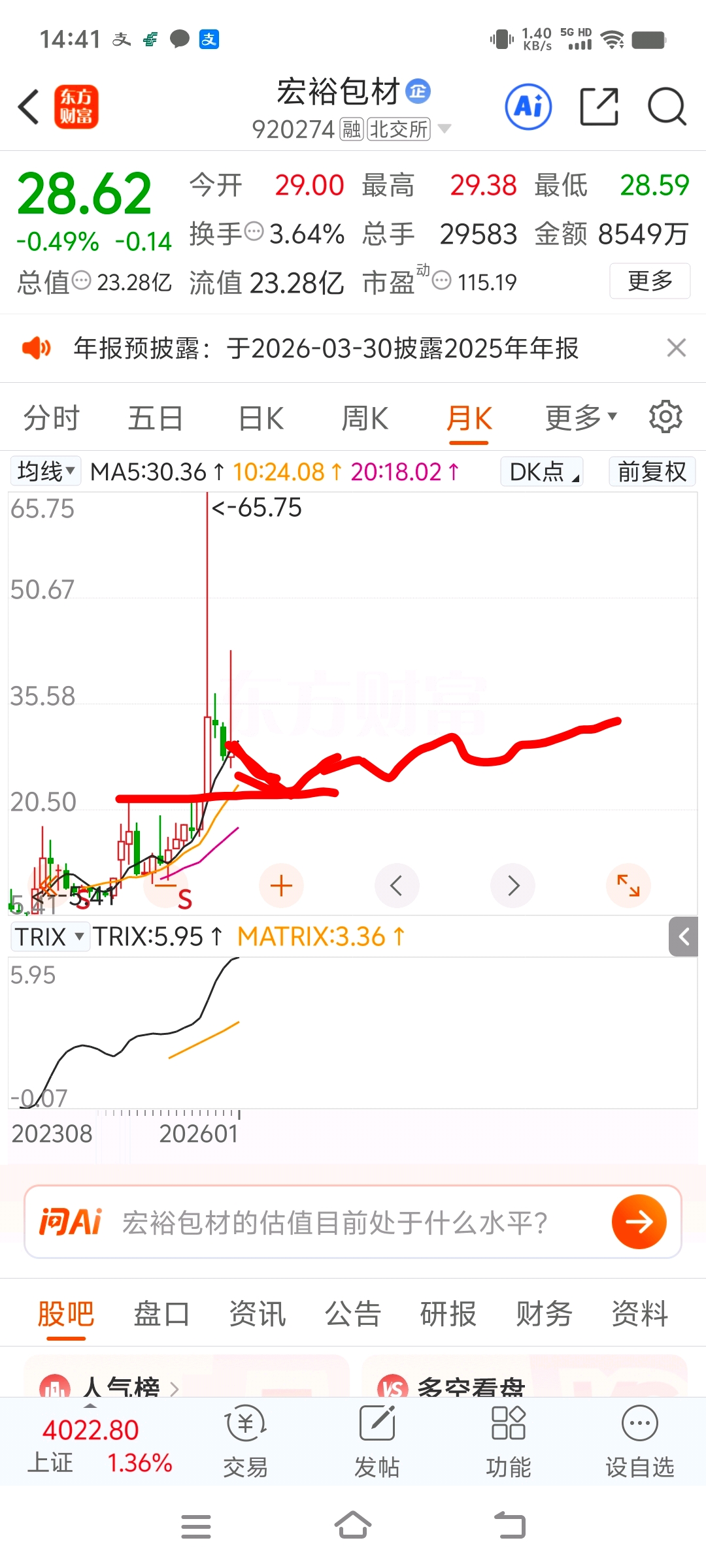 $宏裕包材(SZ920274)$ 前期涨太多,看月线还得调整,年前振荡下跌已成定局