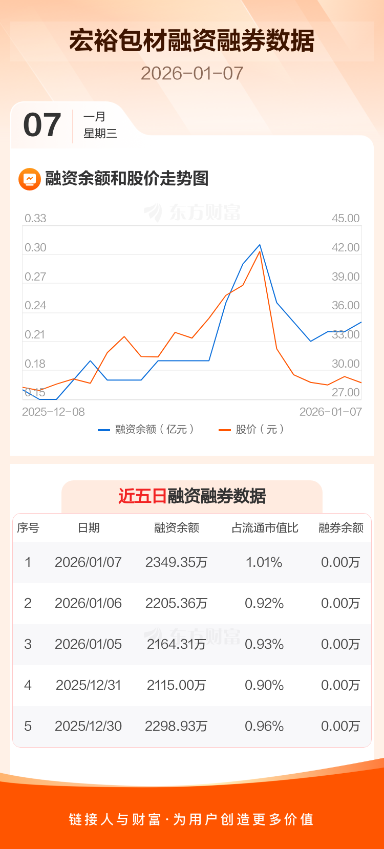 交易所最新数据显示,宏裕包材于2026年1月7日获融资买入505.26万元,融资偿还361.27万元,当日融资净买入143.99万元。目前,该股融资余额2349.35万,占流通市值比例为1.01%。
