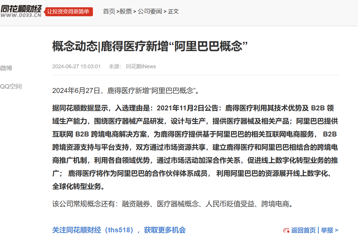 $鹿得医疗(SZ920278)$ 下午涨停板,阿里巴巴
