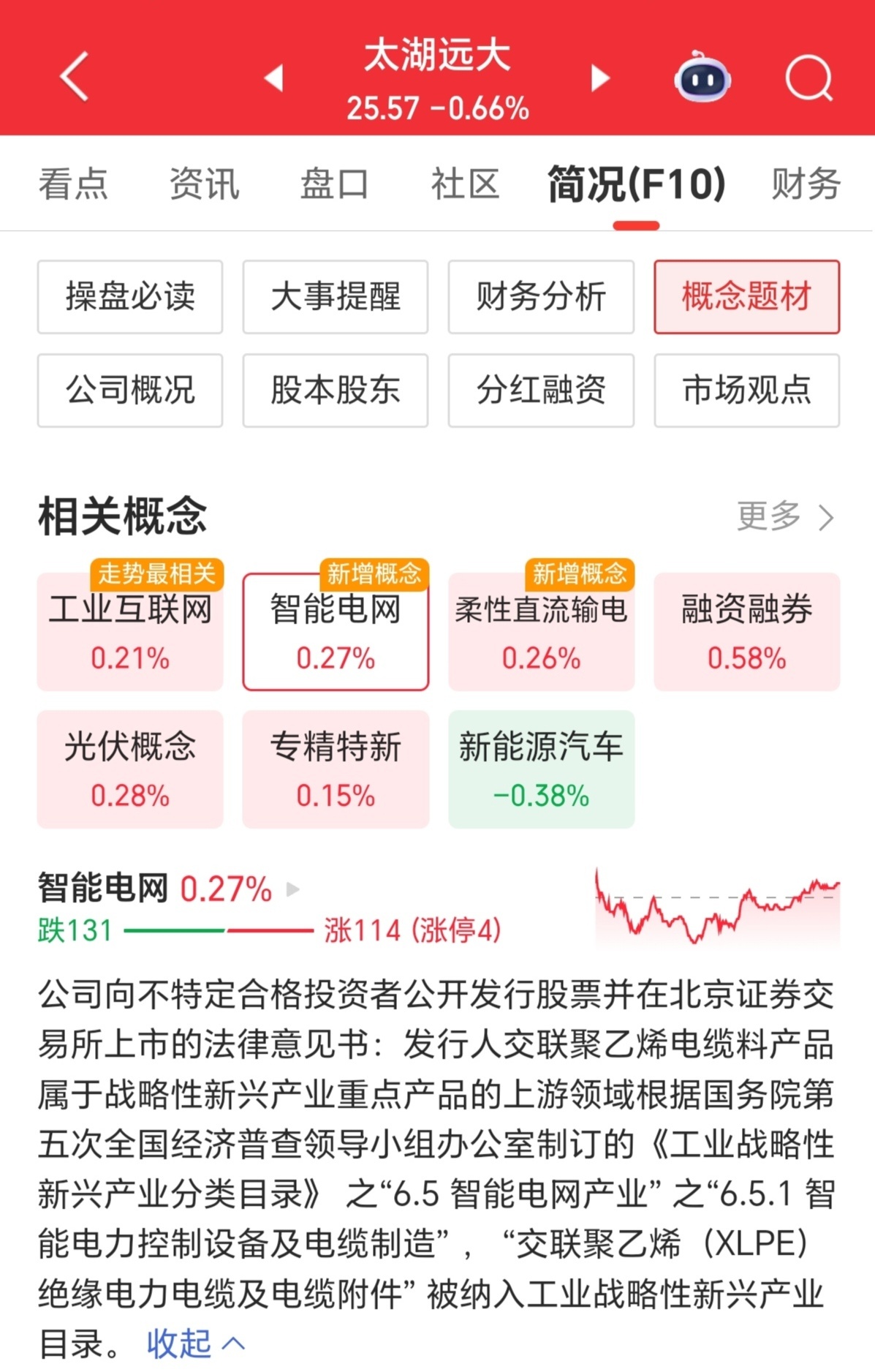 $灿能电力(SZ920299)$ $一致魔芋(SZ920273)$ $太湖雪(SZ920262)$ 新增智能电网,柔性直流输电概念,太湖远大年营收近20亿,总市值才13亿,每股净资产高达十几块