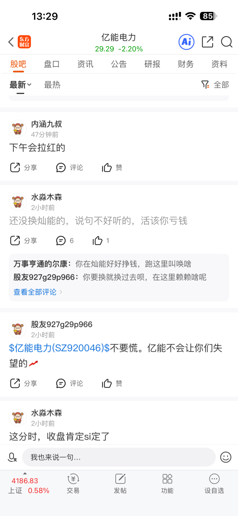 温馨提示: 1.根据《证券法》规定,禁止编造、传播虚假信息或者误导性信息,扰乱证券市场;2.用户在本社区发表的所有资料、言论等仅代表个人观点,与本网站立场无关,不对您构成任何投资建议。用户应基于自己的独立判断,自行决定证券投资并承担相应风险。《东方财富社区管理规定》
