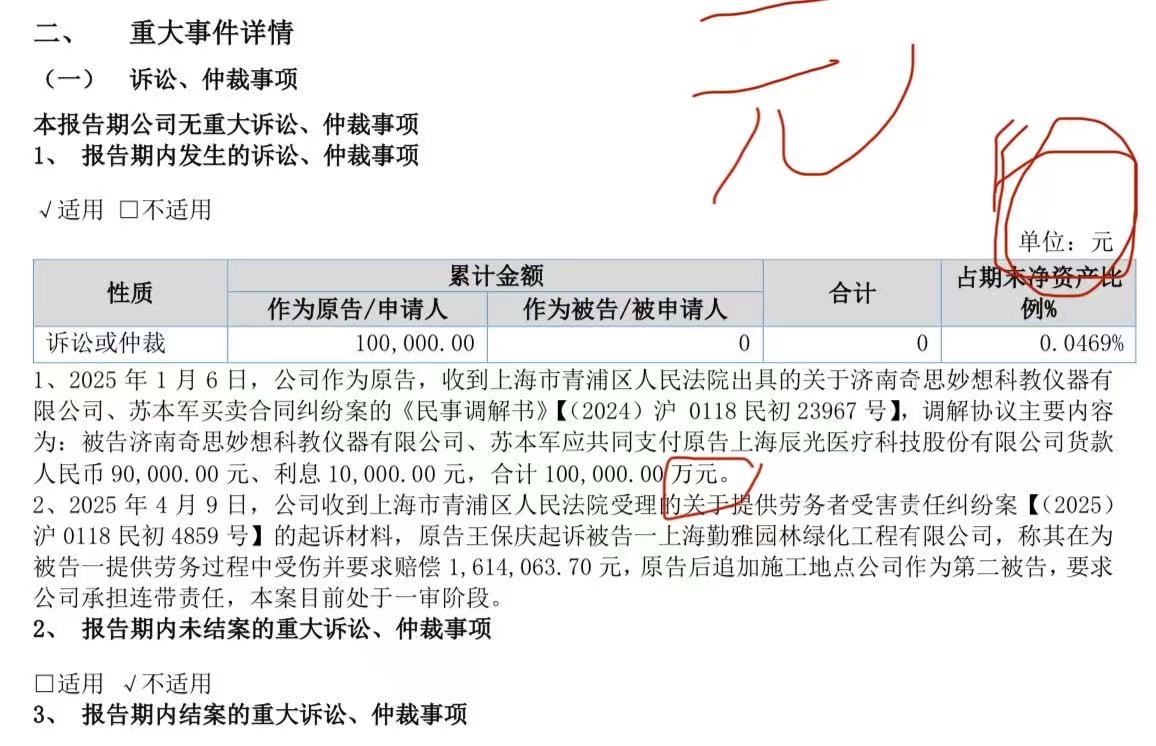 大家去问一下董秘,这个乌龙让我们买单吗?你好,你们把半年报第25页诉讼仲裁第一项,被告济南奇思妙想科教仪器有限公司的诉讼金额是人民币90,000.00元+人民币10,000.00元,合计人民币应该是100,000.00元,怎么会是100,000.00万元呢?按照你们这样应该是10个亿。请你们公司立刻纠正过来。