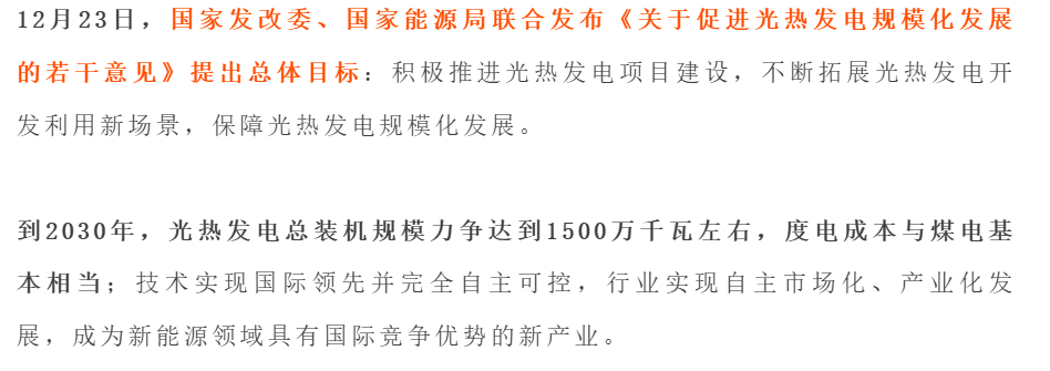 12月23日,国家发改委、国家能源局联合发布《关于促进光热发电规模化发展的若干意