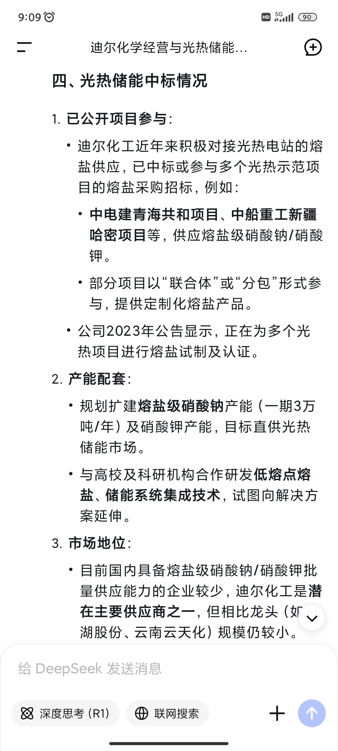 $迪尔化工(SZ920304)$ 硝酸化工包含炸药,化肥,染料同时中标光热储能项目,长期持有应该会有很好收益,唯一的缺点就是规模体量还是太小,处于北交,资金关注不高,盐湖和云天化是行业龙头,劣势中找优势就是抓住机遇能中标多几个