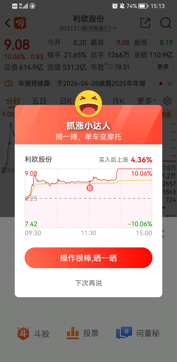 买呢嘛个鬼哦,一个之前炸板收盘的玩意,凭什么高开这么多?尾盘我抄底了,明天随便你,反弹我就卖,再跌我尾盘抄底过节!