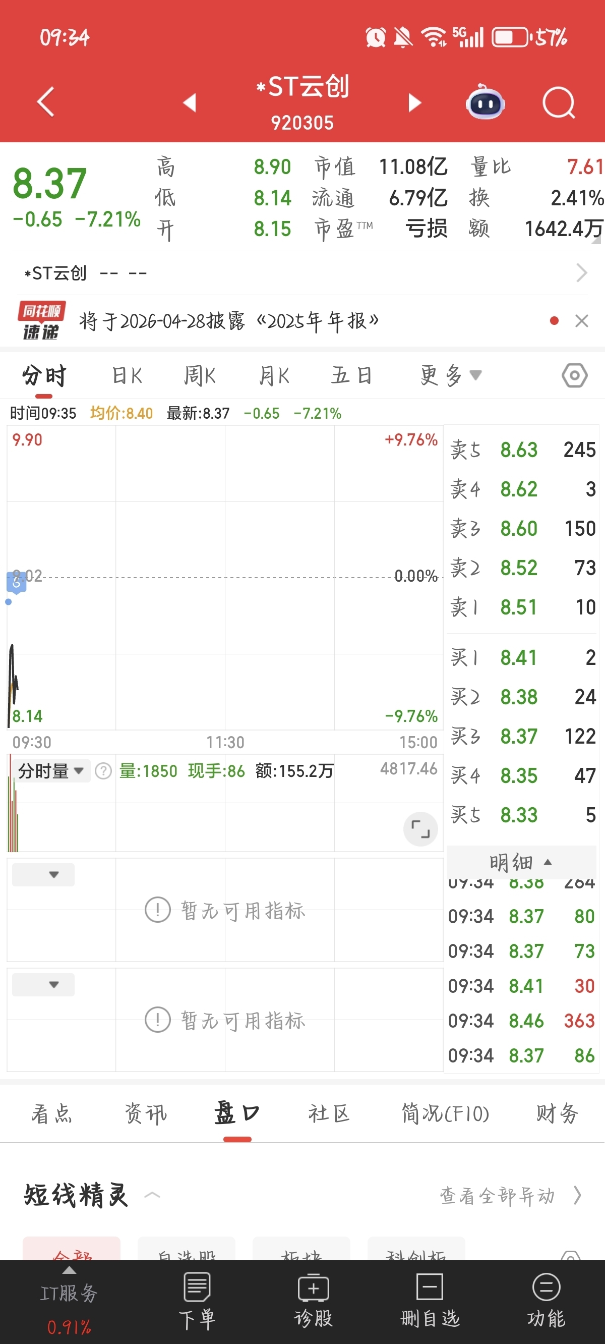 $*ST云创(SZ920305)$ 8.88卖了,原本竞价好好的,24分非要大单往下砸10个点,真蠢