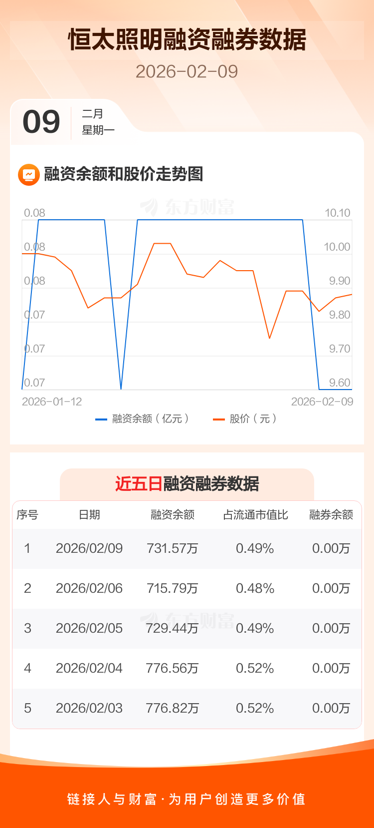交易所最新数据显示,恒太照明于2026年2月9日获融资买入50.41万元,融资偿还34.62万元,当日融资净买入15.78万元。目前,该股融资余额731.57万,占流通市值比例为0.49%。