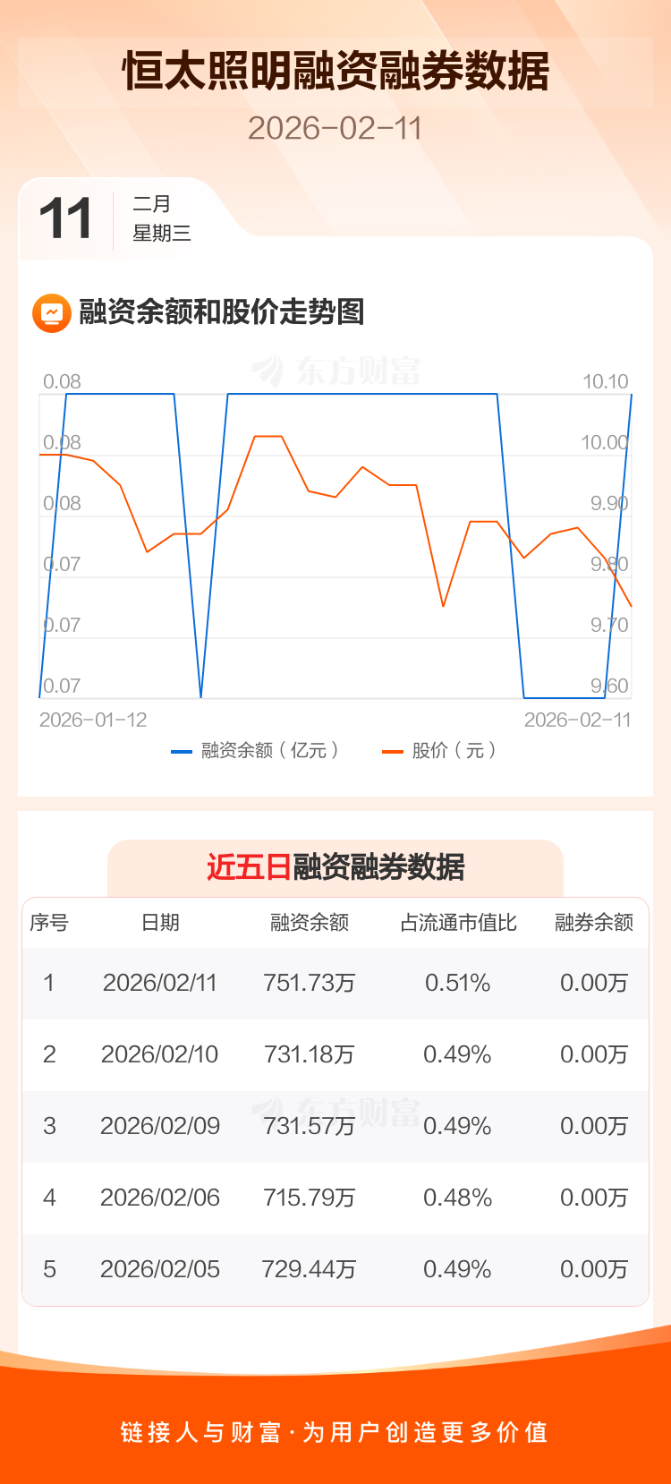 交易所最新数据显示,恒太照明于2026年2月11日获融资买入39.65万元,融资偿还19.10万元,当日融资净买入20.55万元。目前,该股融资余额751.73万,占流通市值比例为0.51%。